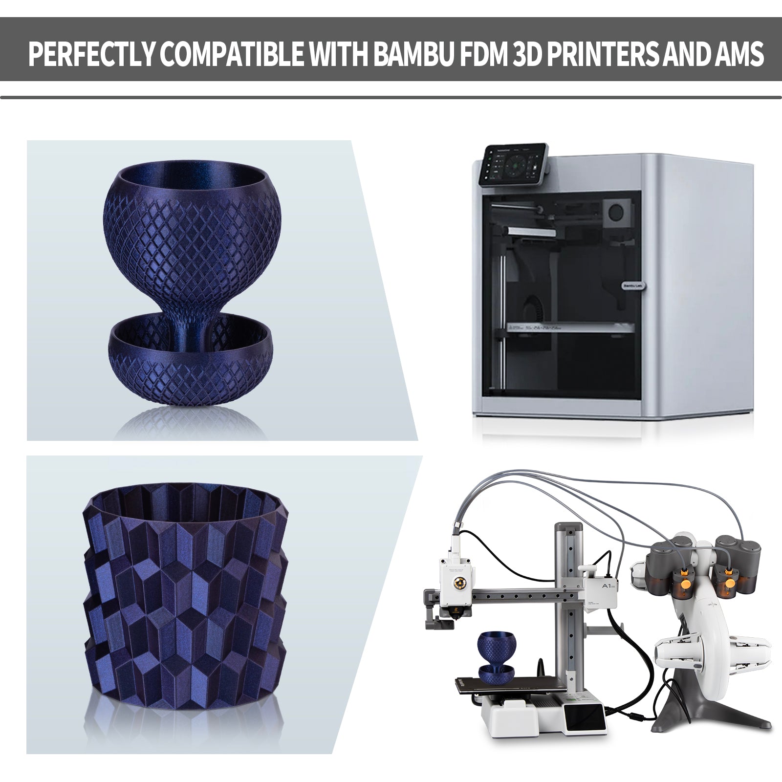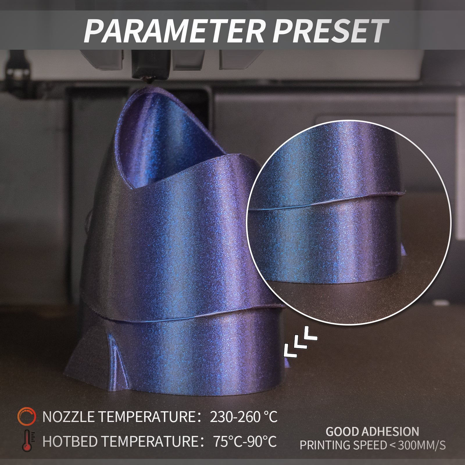 • Galaxy PETG Filament:The unique formula combines two colors on the same filament, resulting in two different color effects when viewed from different angles. In addition, it features a very bright glitter effect under strong light, making it ideal for printing decorations or artworks that require high appearance.