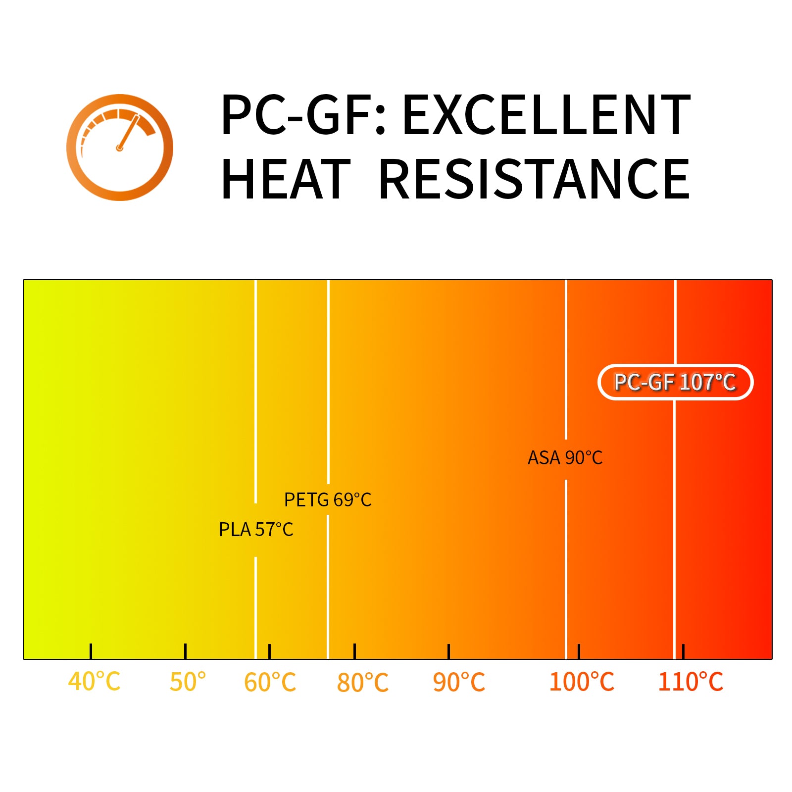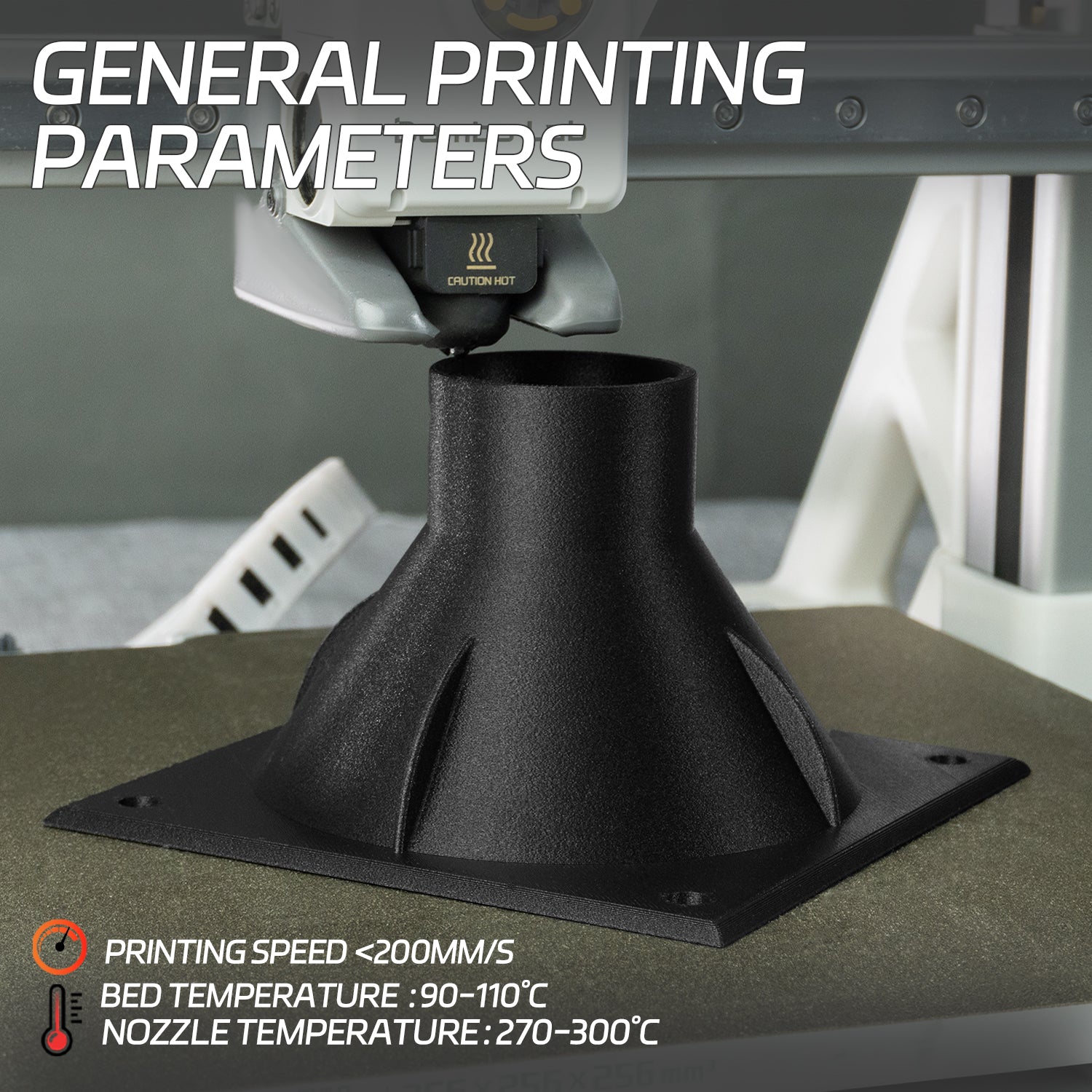 - High-Speed Printing: TINMORRY PC-GF is specially designed and can be printed at high speeds. At 285 °C nozzle temperature, its max printing speed can reach 200 mm/s (common 0.4 mm hardened steel nozzle)