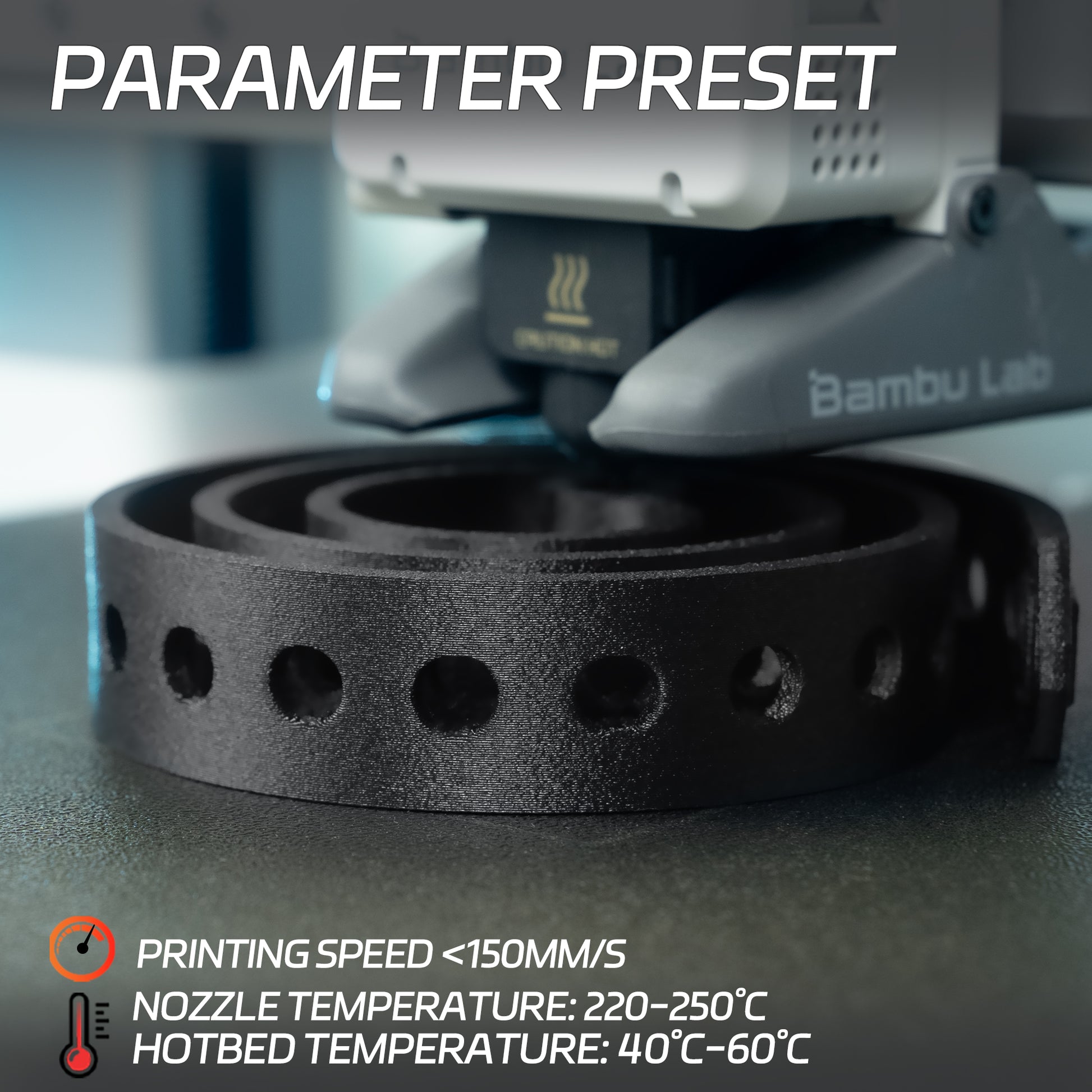 • Higher Flow, Shorter Time: Glass Fiber TPU filament is specially designed and can be printed at high speeds. At 235 °C nozzle temperature, its maximum printing speed can reach 250 mm/s (common 0.4 mm hardened still nozzle), which is the same as PLA Basic and much higher than generic TPU 95A. Therefore, when printing models with it, the time can be greatly shortened and the efficiency can be greatly improved.