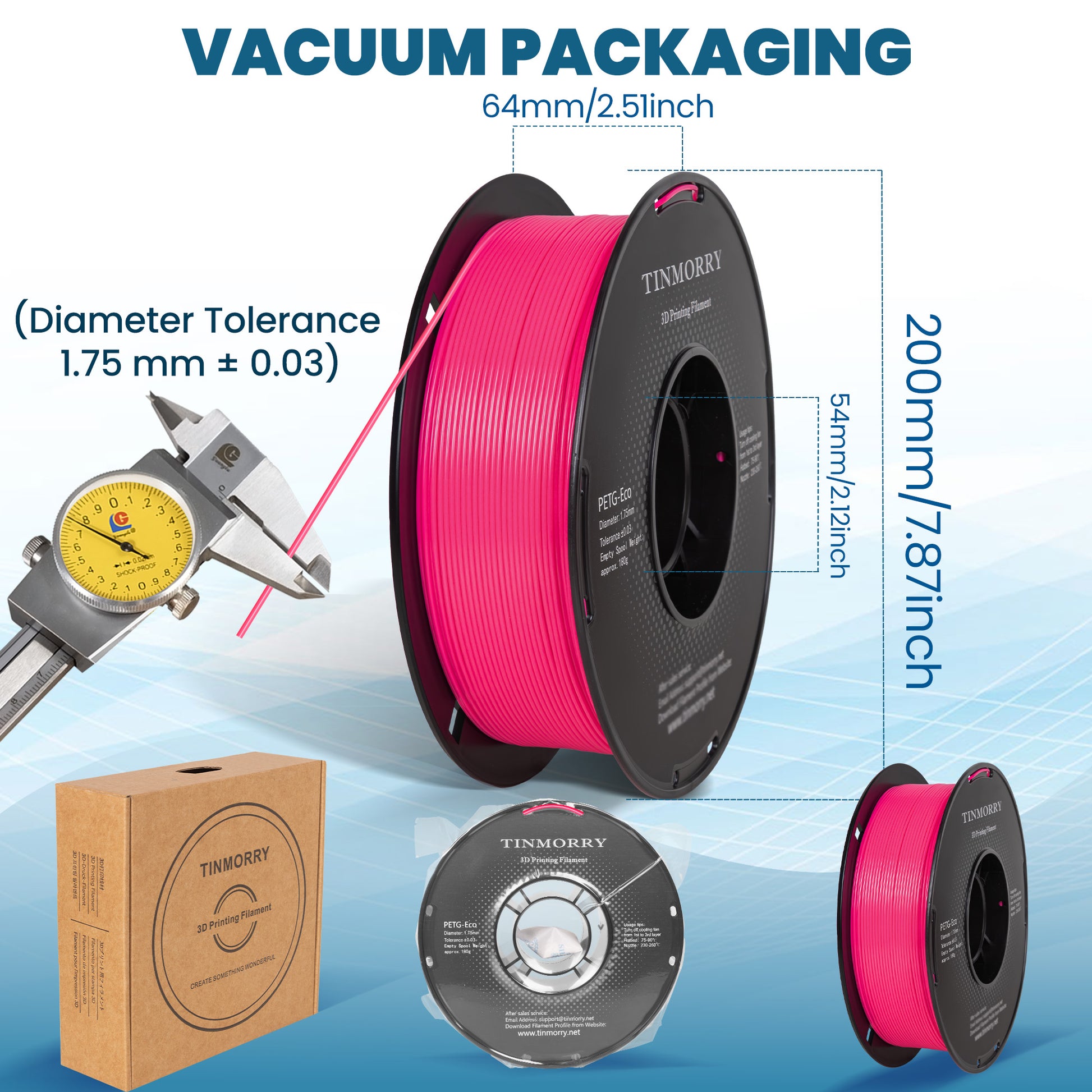 - Less prone to tangling and clogging: With a diameter of 1.75±0.03mm, TINMORRY PETG-Eco filament is completely mechanically wound and strictly inspected manually to ensure clean winding and easy feeding. The new formula also significantly improves print quality by reducing nozzle clogging and clumping compared to other brands of PETG.