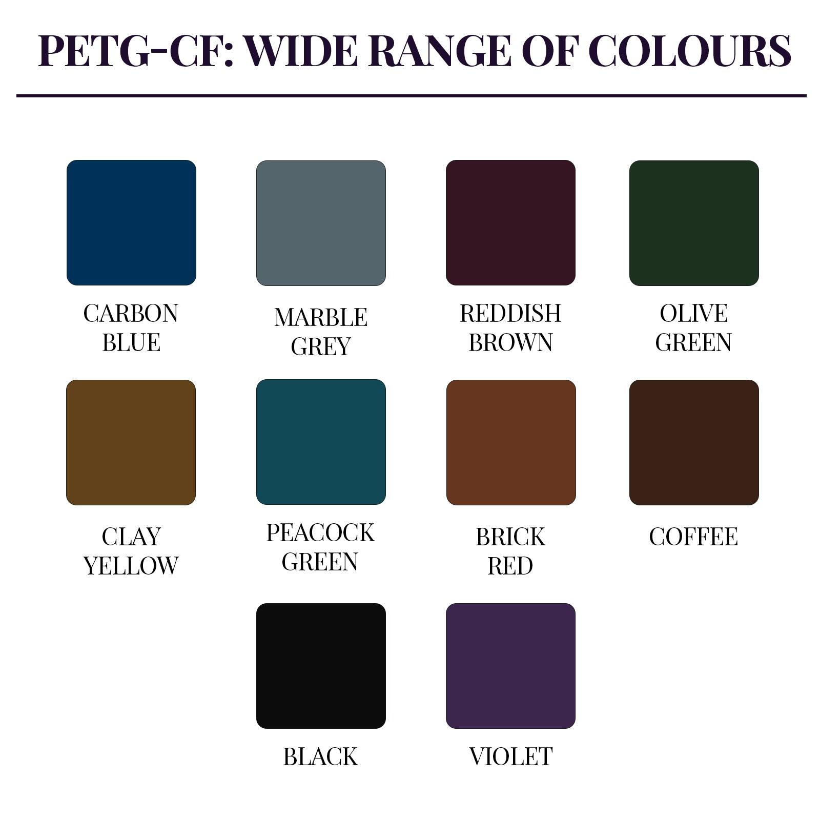 Please note: 1. The same color of PETG-CF has slightly different effects (Shiny or Matt) on different print models. 2. Different resolutions and devices may result in slightly different color displays!