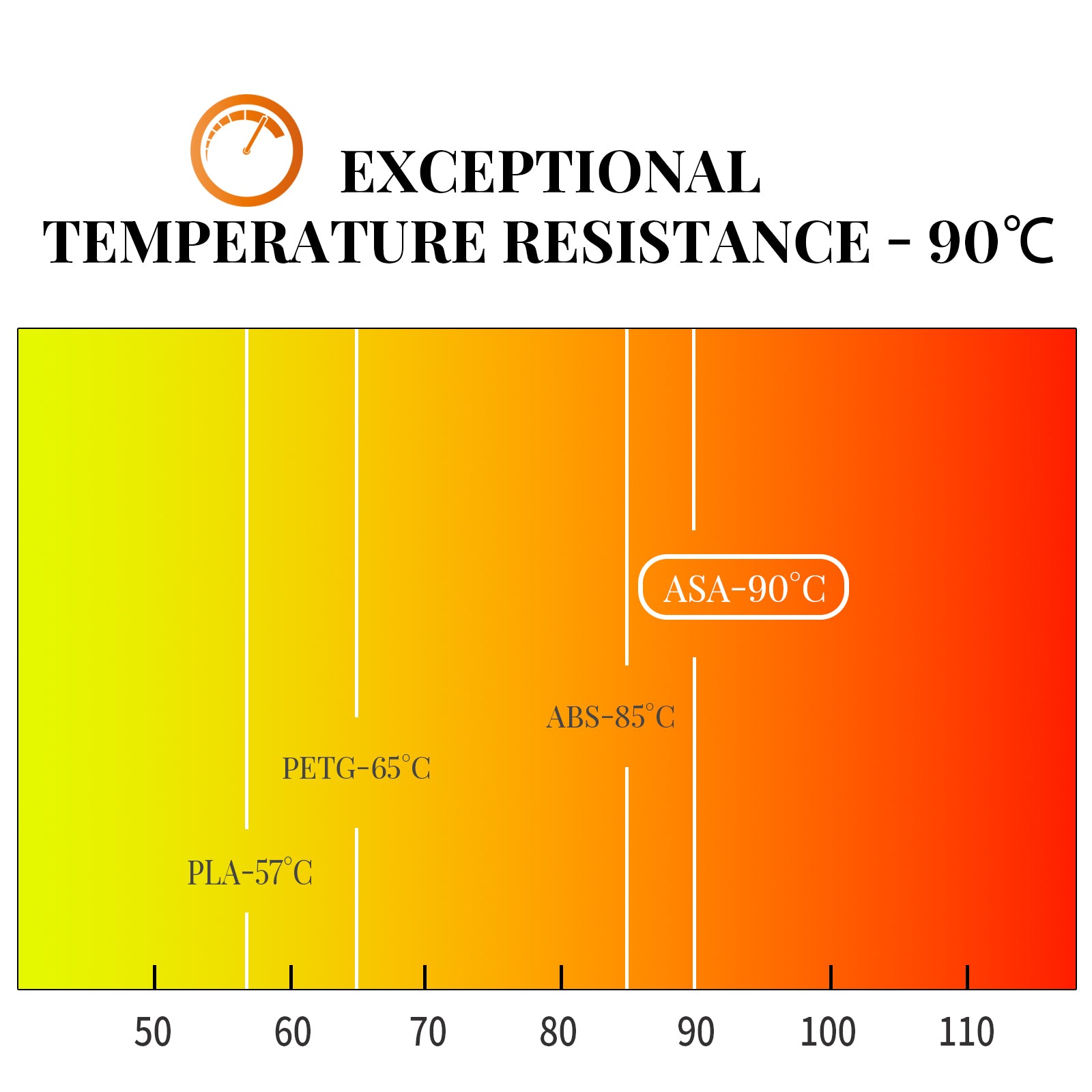 - Exceptional Temperature Resistance: Compared to ABS filament,ASA filament has a higher thermal resistance, which can withstand temperatures up to 100˚C. TINORRY ASA filament can withstand higher temperatures without distortion.