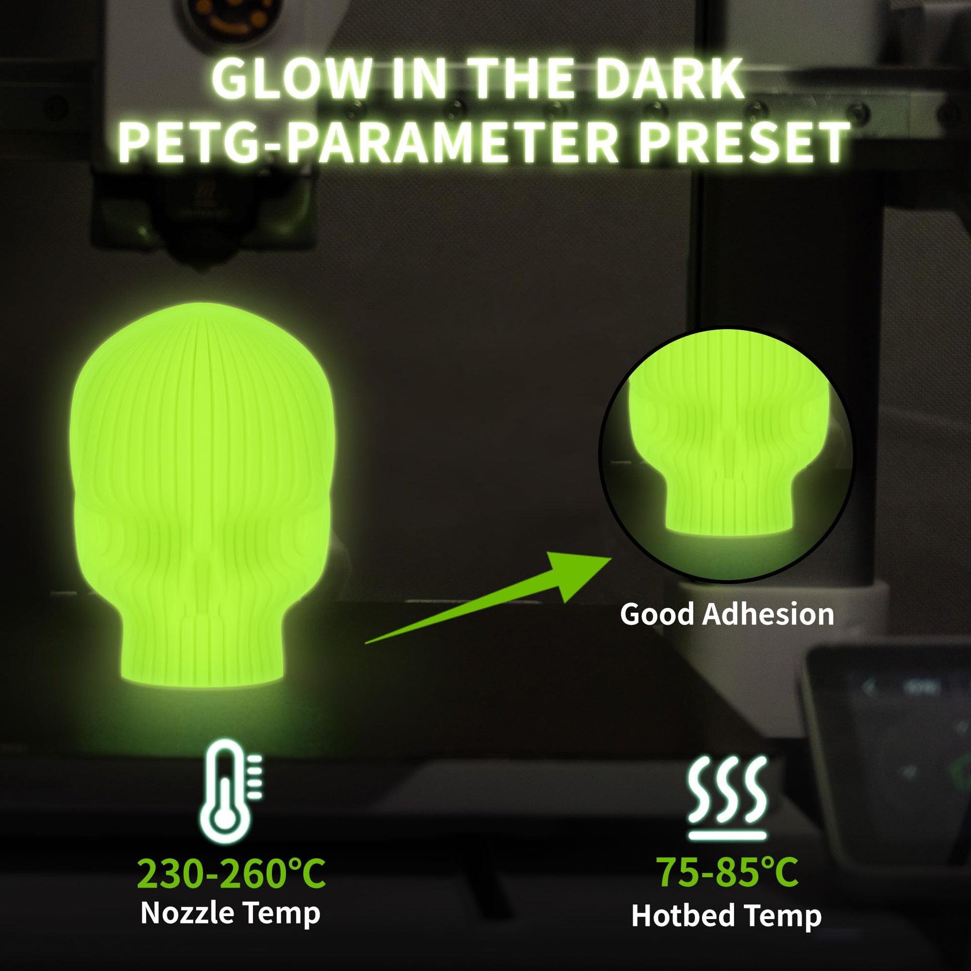 【Glow in the Dark】 TINMORRY Glow Green PETG Filament contains glow in the dark powder, which provides a long-lasting glow effect in the dark after absorbing light energy, perfect for printing decorations for parties and festivals. We recommend exposing it to sunlight or UV light for a period of time to get a long-lasting glow effect.